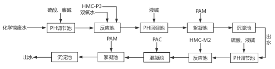 針對(duì)同時(shí)含磷、含鎳的廢水,可先使用我司研自主研發(fā)的專利產(chǎn)品-次亞磷去除劑HMC-P3,利用均相共沉淀技術(shù)不僅可以將次亞磷沉淀去除,而且有一定的破絡(luò)效果,減弱了絡(luò)合劑對(duì)鎳離子絡(luò)合,從而再用HMC-M3時(shí),除鎳更加徹底,極大地降低了處理成本。