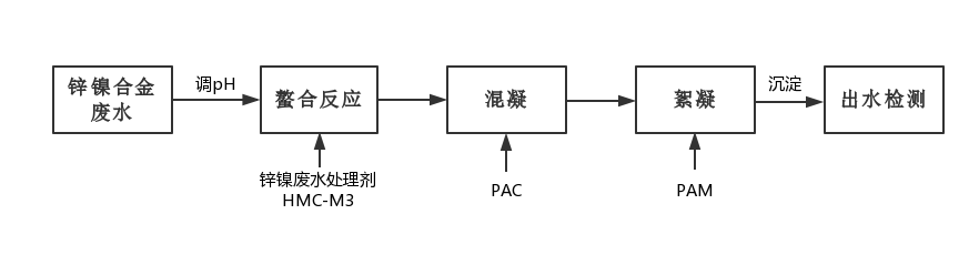 2、調(diào)節(jié)廢水pH至酸性條件下,加入鋅鎳廢水處理劑HMC-M3進行螯合
