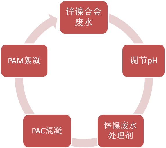 鋅鎳合金廢水是指電鍍鋅鎳合金時(shí)產(chǎn)生的廢水,在零部件進(jìn)行電鍍以后,表面需要被沖洗,沖洗產(chǎn)生的清洗水,成為堿性鋅鎳合金電鍍廢水。該廢水基本與鋅鎳合金電鍍液成分一致,成分復(fù)雜,包含鎳離子、鋅離子、鋅絡(luò)合劑、鎳絡(luò)合劑等。廢水中的絡(luò)合劑是由多種有機(jī)物組成,如檸檬酸、酒石酸、乳酸、蘋果酸、EDTA等,多種絡(luò)合劑與鋅離子、鎳離子等生成強(qiáng)結(jié)合鍵,pH呈現(xiàn)弱堿性,導(dǎo)致廢水難以處理達(dá)標(biāo)。
