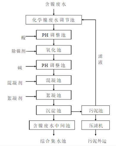 含鎳廢水主要來自電鎳金生產線和沉鎳金生產線,電鎳或沉鎳工序后的漂洗水。典型的化學鍍鎳工藝以次磷酸鹽為還原劑,廢水中主要污染物為鎳離子(以絡合態(tài)存在)、磷酸鹽(包括次磷酸鹽、亞磷酸鹽)及有機物。其中鎳離子廢水,環(huán)保要求需對其進行單獨處理。