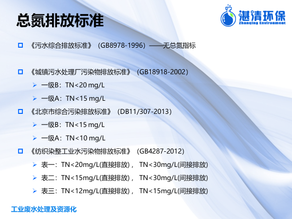目前城鎮(zhèn)污水處理廠污染物排放標(biāo)準(zhǔn)中要求,總氮濃度排放標(biāo)準(zhǔn)一級(jí)B要求為20mg/L,一級(jí)A為15mg/L。北京市綜合污染物排放標(biāo)準(zhǔn),一級(jí)B總氮排放低于15mg/L,一級(jí)A總氮排放低于10mg/L。紡織染整工業(yè)水污染物排放標(biāo)準(zhǔn)表一要求總氮小于20mg/L,表二要求總氮低于15mg/L,表三要求總氮低于12mg/L。