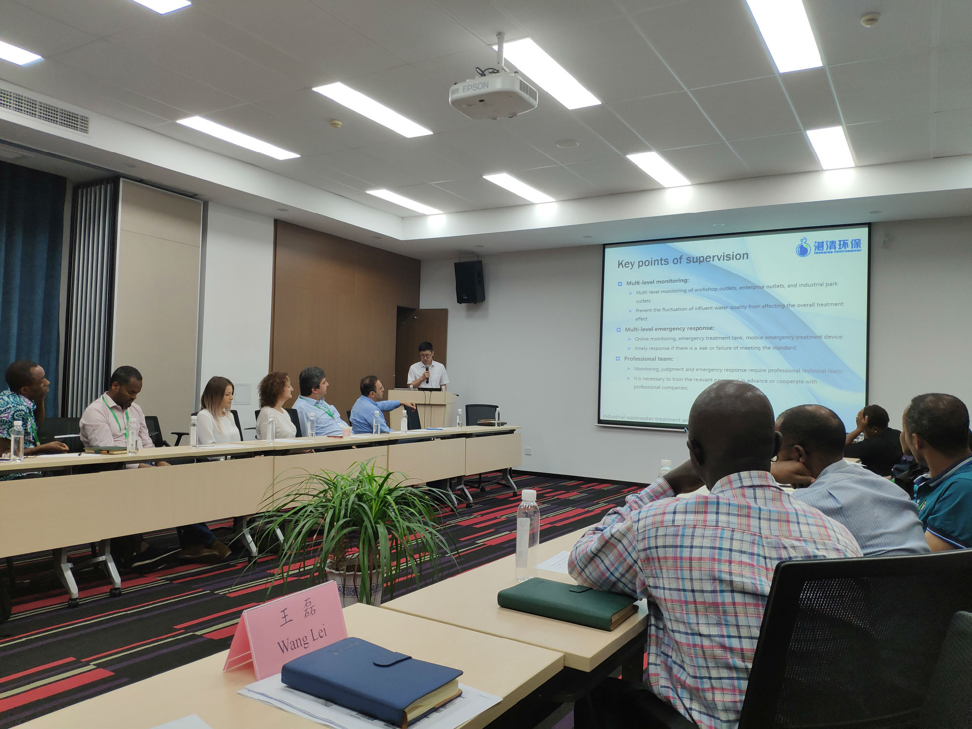 湛清環(huán)??偨?jīng)理王磊向研修班學(xué)員詳盡的介紹了湛清環(huán)保的核心業(yè)務(wù)、技術(shù)優(yōu)勢(shì)以及針對(duì)工業(yè)園區(qū)廢水處理的許多建議,并表達(dá)了我們?cè)敢馀c一帶一路沿線國(guó)家合作共贏、安全共筑、和諧共生的美好愿景。
