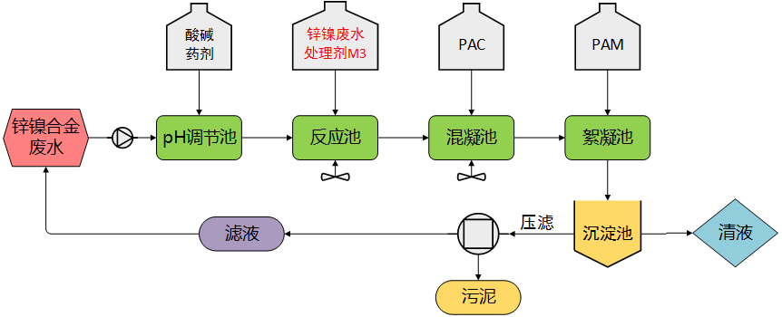 對(duì)于總鎳>20mg/L的堿性鋅鎳合金廢水,建議按照以下工藝進(jìn)行處理: