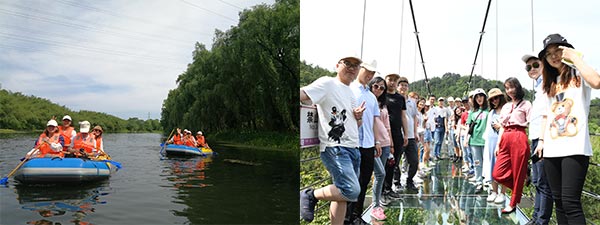 欣賞完表演,悠閑自在,就來尋找一些刺激玩法吧。玻璃棧道、索道橋,給人一種驚險又興奮的感覺。湖面漂流,更是讓我們感受到了精誠團(tuán)結(jié)、激情洋溢、青春活力的濃濃團(tuán)隊情。我們一路上興致勃勃地參觀,當(dāng)夕陽西下時,才戀戀不舍地離開。