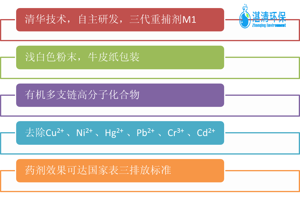 第三代重捕劑M1是固體淺白色粉末,有機高分子化合物,能夠與常見的Cu2+ 、Ni2+ 、Hg2+ 、Pb2+ 、Cr3+ 、Cd2+等發(fā)生螯合反應(yīng),變?yōu)闊o害污泥而除去,可以達到國家表三標準要求。