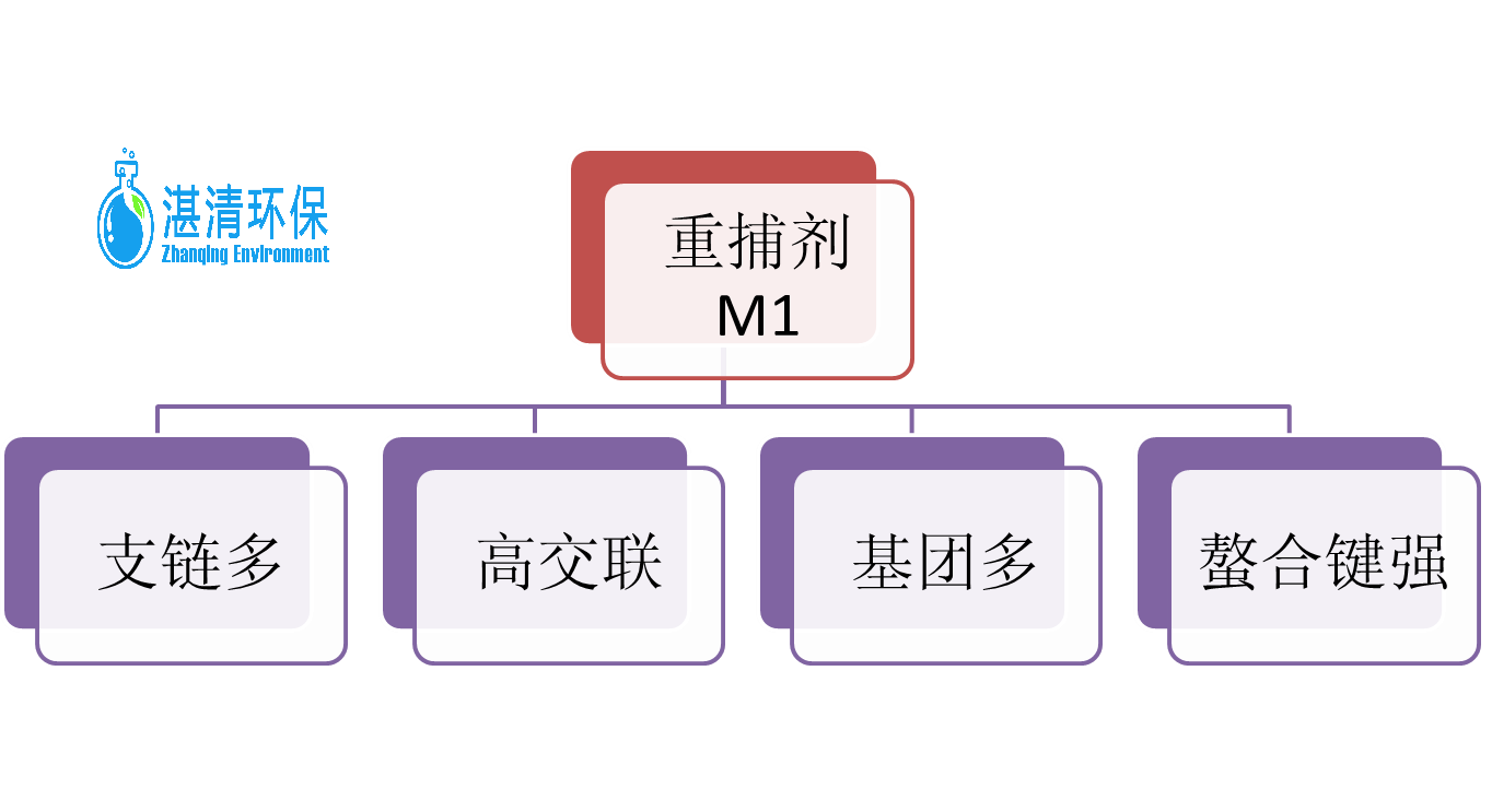 第三代重捕劑M1在結(jié)構(gòu)上體現(xiàn)為兩點優(yōu)勢,第一,重金屬螯合基團多,重捕劑M1在微觀結(jié)構(gòu)上是一種多支鏈高交聯(lián)的有機分子,第三代重捕劑M1的支鏈多,交聯(lián)程度復(fù)雜,支鏈上的官能團多,相對應(yīng)的結(jié)合重金屬的量更多,等量的重捕劑,M1結(jié)合的重金屬的量更大;第二,與重金屬螯合能力更強,重捕劑M1的官能團表面電荷多,更容易極化變形生成電場,從而吸附陽離子生成螯合鍵,相比與其他重捕劑,M1的吸附力更強。